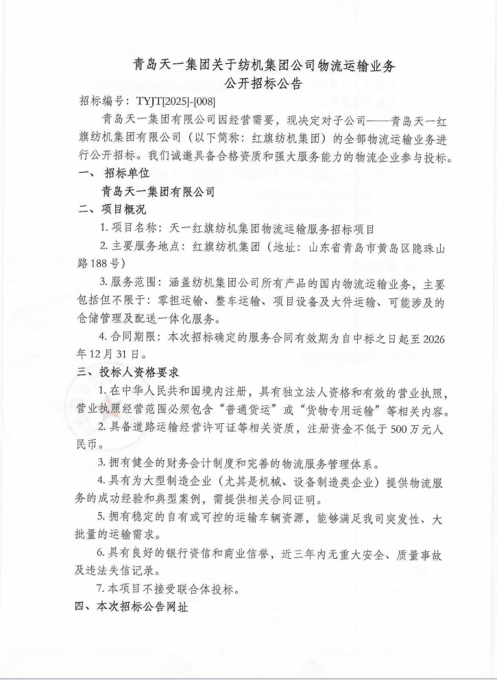 青島天一集團關于紡機集團公司物流運輸業務公開招標公告.