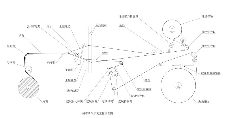 該產(chǎn)品可以織造經(jīng)起絨絨布組織要求的雙層布織物,上下兩層之間有一定高度的絨經(jīng),后經(jīng)過割絨機(jī)將其割開形成兩塊絨布。該產(chǎn)品采用智能化絨布噴氣織機(jī)專用控制系統(tǒng),可以實(shí)現(xiàn)電子送經(jīng)(地經(jīng)、絨經(jīng)分別控制)、電子控制起絨、電子多臂開口、電子控制管道片式噴氣引緯等功能,在織造過程中可以保持張力穩(wěn)定、絨高織造控制精確,采用噴氣式引緯方式不會與經(jīng)紗邊紗摩擦產(chǎn)生毛板,管道片接力引緯更能夠提高引為效率和降低能耗。